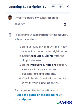 Here, the AI-powered chatbot, ChatSpot, by HubSpot is in use to locate my subscription tier.